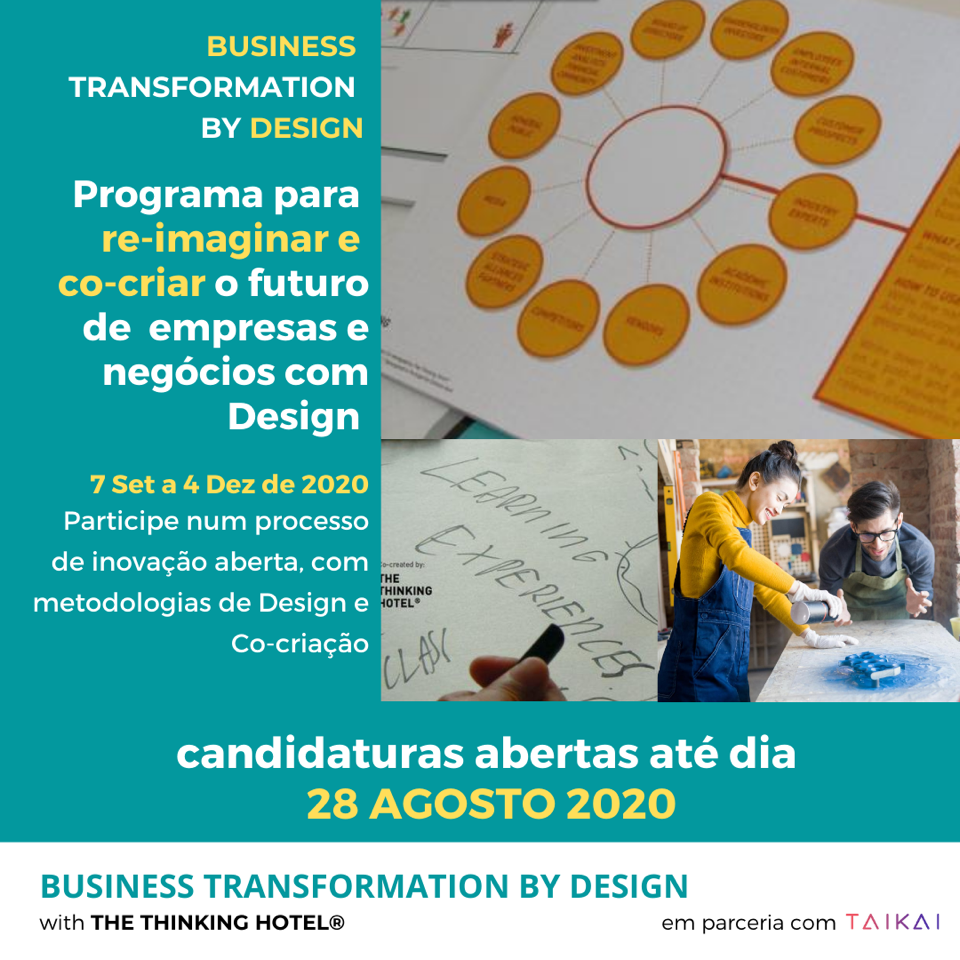 BUSINESS TRANSFORMATION BY DESIGN é uma iniciativa de uma equipa diversificada e independente, representada por The Thinking Hotel em parceria com a TAIKAI, que conta com o apoio de: NEST Centro de Inovação do Turismo, Mulheres à Obra, Women in Tech Portugal e Women in Tech Angola e AND.